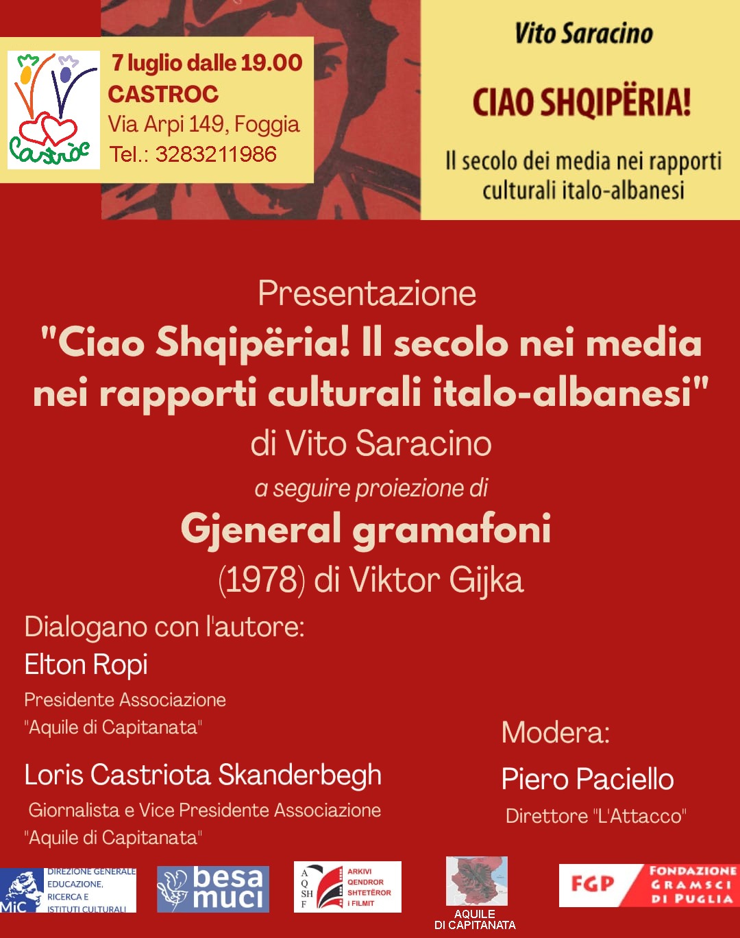 L’Associazione culturale “Aquile di Capitanata” ha organizzato per venerdì 7 luglio 2024, alle ore 19, nello spazio dehors del ristorante-caffè “Castroc” di Foggia (via Arpi 149), la presentazione del libro “Ciao Shqipëria! Il secolo dei media nei rapporti culturali italo-albanesi” (Besa Muci editore, Nardò, 2021), scritto da Vito Saracino, storico dei media, docente a contratto di Storia Sociale dei Media all’Università di Foggia e ricercatore Fondazione Gramsci di Puglia.