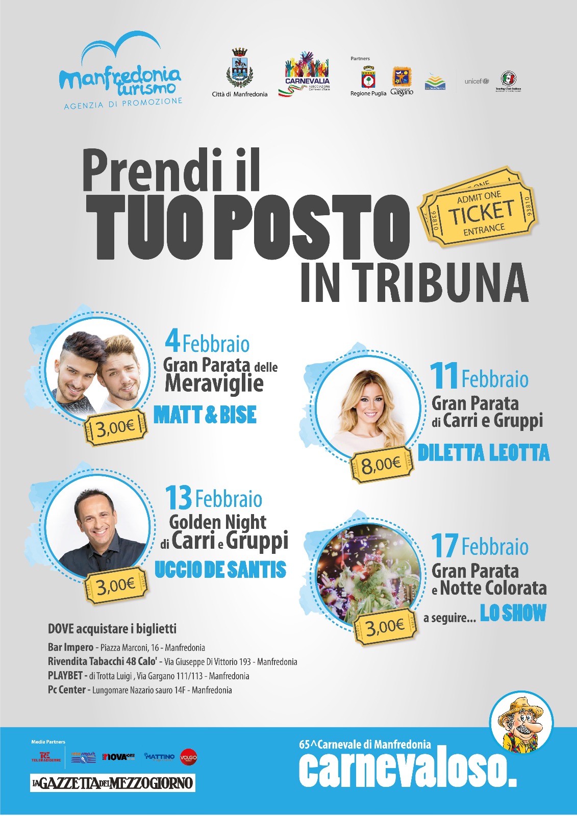 I biglietti per le due tribune sono in vendita a questo link https://bookingshow.it/Ricerca?keyword=CARNEVALE+DI+MANFREDONIA.
