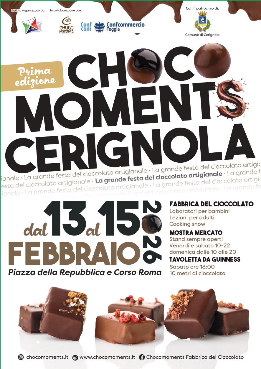 Dal 13 al 15 febbraio, in occasione del Carnevale e di San Valentino, in Corso Roma (vicino Piazza della Repubblica) si svolgerà la grande Festa del Cioccolato Artigianale – Choco Moments Cerignola, iniziativa promossa dal Comune di Cerignola in collaborazione con Confcommercio Imprese per l’Italia, FIVA, Confcommercio Foggia e Cerignola.