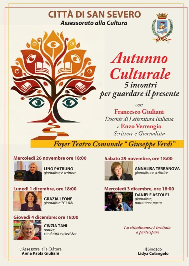 Il Comune di San Severo – Assessorato alla Cultura presenta la prima edizione dell’evento ’“Autunno Culturale”, un ciclo di cinque appuntamenti culturali di grande rilievo nazionale.