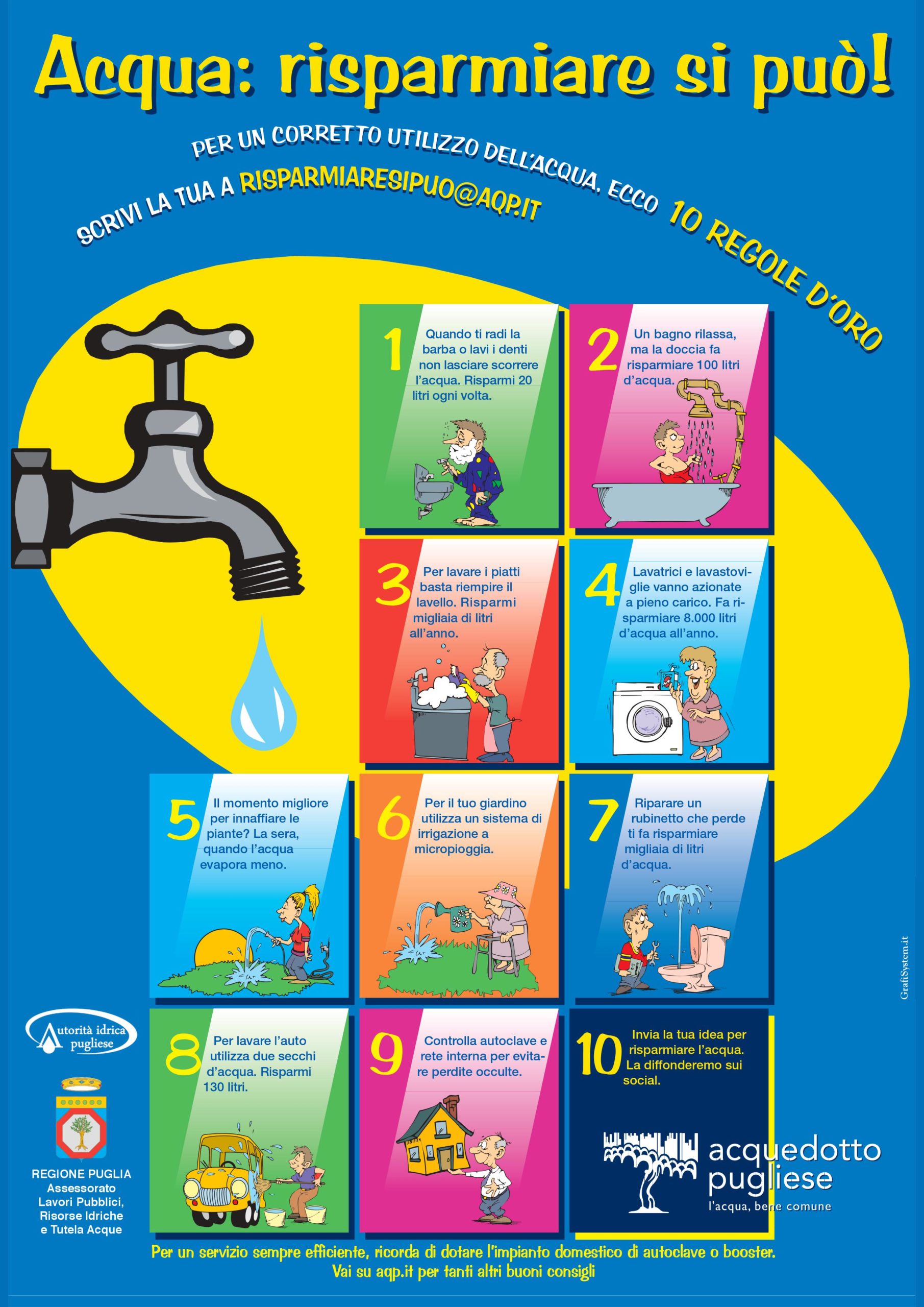 AQP li diffonderà su facebook, twitter e google+. La ridotta disponibilità di acqua dalle sorgenti storiche di Caposele e Cassano Irpino (30% in meno rispetto alla media del periodo) e dagli invasi (175 milioni di mc in meno invasati rispetto allo scorso anno) impongono grande attenzione. La stessa Regione Puglia, nei giorni scori, ha emesso un decreto per l’emergenza idrica disponendo il divieto di utilizzare l’acqua potabile per usi impropri. L’azienda ha attivato per tempo un piano di attività, grazie al quale sono stati recuperati 58 milioni di mc di risorsa (pari alla capacità di una diga di medie dimensioni), che allo stato attuale consente di offrire il servizio senza significative criticità. “È davvero opportuna l’iniziativa dell’AQP di sensibilizzare la popolazione pugliese all’uso razionale e intelligente dell’acqua – ha commentato l’Assessore regionale ai Lavori Pubblici, Annamaria Curcuruto. Efficace ed immediata anche la comunicazione attraverso un decalogo realizzato con immagini adatte a tutte le età. Anche i più piccoli in casa, infatti, faranno la loro parte. Le ordinanze anti spreco da sole non bastano. È necessaria un’azione anche culturale perché tutti riflettano sulle proprie abitudini e agiscano sui comportamenti. Oltre al beneficio economico, questa volta l’obiettivo è di risparmiare una risorsa ancora più preziosa del denaro, l’acqua, soprattutto in questo particolare momento di scarsità”. “Per rendere disponibile l’acqua ai cittadini – ricorda il Presidente di AQP, Nicola De Sanctis – dobbiamo prelevarla da altre regioni, potabilizzarla attraverso processi industriali raffinati ed onerosi e trasportarla per migliaia di chilometri, fino a raggiungere l’utente finale. Un bene, dunque, tanto prezioso quanto delicato e fragile che necessita di essere preservato e protetto da ogni singolo cittadino. Quindi, è nel senso di responsabilità di tutti (delle istituzioni, dei gestori, degli agricoltori per gli usi irrigui, delle industrie e dei semplici cittadini) adempiere a tale compito, soprattutto in questo momento particolarmente delicato”. “Ognuno deve fare la sua parte, nessuno escluso – ha commentato il Presidente dell’AIP, Nicola Giorgino – ed ogni piccolo gesto risulta utile allo scopo. Occorre una maggiore cura nei gesti quotidiani che riteniamo banali e scontati ma che non lo sono. Risparmiare si può e soprattutto si deve: stante le attuali condizioni generali nazionali ed una più ridotta disponibilità idrica alle fonti, tutti i cittadini devono sentirsi responsabili attuando le misure indicate nelle dieci semplici regole di questa campagna comunicativa. Il risparmio idrico e l’attenzione a politiche più corrette e sane in ogni nostro piccolo e grande gesto passano dalla quotidianità negli aspetti apparentemente più comuni e dimessi. Non dimentichiamolo mai”.