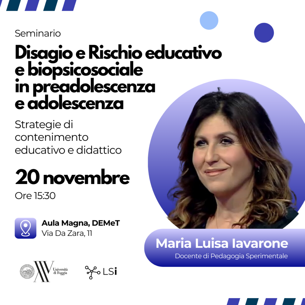 Il Learning Sciences institute dell’Università di Foggia è pronto ad accogliere il 20 Novembre 2024 la Prof.ssa Maria Luisa Iavarone, una delle principali voci accademiche italiane nel campo della pedagogia, con un’attenzione particolare alle dinamiche educative e sociali che influenzano il benessere individuale e collettivo.
