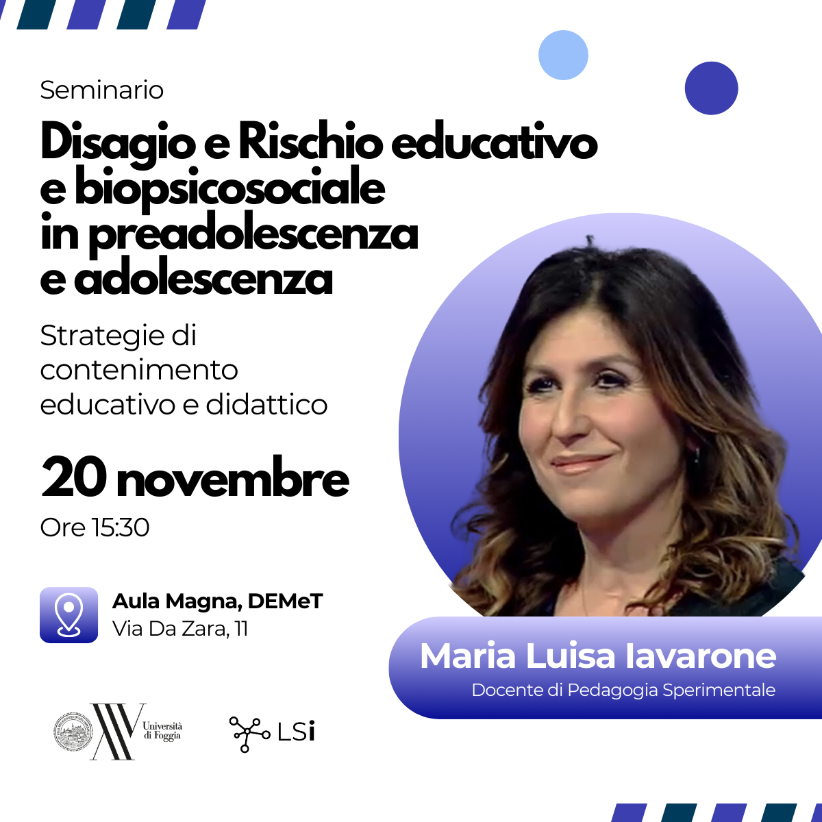 La prof.ssa Iavarone, il 20 Novembre 2024 terrà una lezione ai corsisti del TFA intitolata Disagio e Rischio educativo e biopsicosociale in pre adolescenza e adolescenza: strategie di contenimento educativo e didattico.