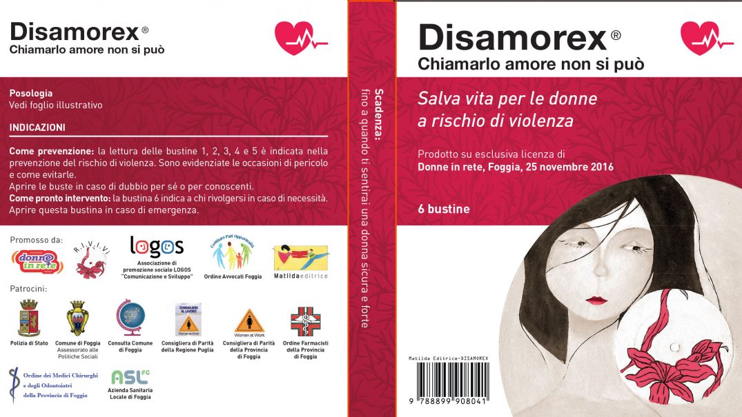 “DISAMOREX”, in realtà, è un prodotto educativo e culturale, che serve a spiegare e riconoscere le varie forme di violenza, così da poterle prevenire oppure difendersi. Esso nasce da una idea dell’Associazione “DONNE in RETE”, che lo ha realizzato in collaborazione la rete R.I.V.I.VI. , l’Associazione LOGOS, il Comitato per le Pari Opportunità dell’Ordine Forense di Foggia e la Casa Editrice MATILDA, che ne ha curato la pubblicazione.