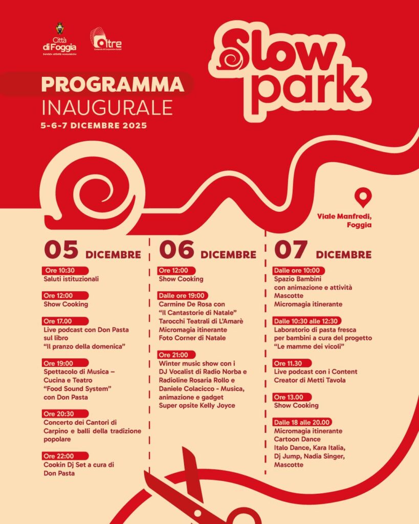 IL PROGRAMMA. L’inaugurazione della struttura sarà animata da tre giorni di eventi, show cooking, giochi, musica, laboratori, attività varie, destinati a bambini, famiglie, adulti e giovani. Nelle giornate del 5 e 6 dicembre sarà presente Don Pasta (Daniele De Michele), scrittore, artista, dj, performer, appassionato di gastronomia, considerato dal New York Times uno dei più inventivi attivisti del cibo. Prezioso anche il concerto serale del giorno inaugurale dei Cantori di Carpino con balli della tradizione popolare. Sabato 6, invece, tra gli appuntamenti in programma il Winter music show con i DJ Vocalist di Radio Norba e Radioline Rosaria Rollo e Daniele Colacicco. Super ospite Kelly Joyce. La domenica, infine, sarà dedicata alle iniziative di animazione rivolte principalmente ai più piccoli. Dopo il taglio del nastro, sarà poi lanciato il calendario di eventi natalizi che animeranno da dicembre a gennaio gli spazi e i locali dello “Slow Park”.
