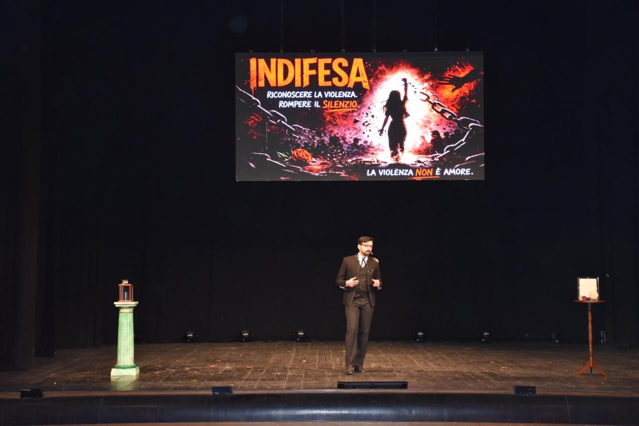Al centro dell’esperienza vi è l’utilizzo dello stupore come strumento pedagogico, capace di rendere visibili le forme di violenza spesso invisibili e trasformare l’emozione in consapevolezza. Il titolo racchiude un duplice significato: “Indifesi”, come condizione delle vittime, e “In Difesa”, come responsabilità collettiva nel proteggerle. «La conferenza-spettacolo si sviluppa attraverso sette quadri metaforici – spiega Danilo Audiello, meglio noto come Alexis Arts, detentore di 7 Guinness dei primati – che accompagnano il pubblico in un viaggio emotivo e simbolico: dall’invisibilità al silenzio, dalla paura all’isolamento, fino alla rinascita. Un percorso narrativo che mira a generare empatia, stimolare il dialogo e promuovere una cultura fondata sul rispetto, sulla consapevolezza e sulla solidarietà».