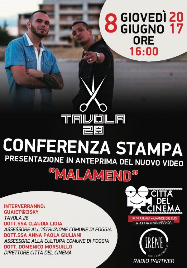 Il videoclip della canzone sarà presentato oggi, 8 giugno, alle 16:00 alla Città del Cinema di Foggia. Alla conferenza stampa parteciperanno, oltre a Cisky e Guaiet dei Tavola 28, l’assessore comunale alla Pubblica istruzione, Claudia Lioia; l’assessore comunale alla Cultura, Anna Paola Giuliani e il direttore della Città del Cinema, Domenico Morsuillo. Radio partner sarà Radio Irene.