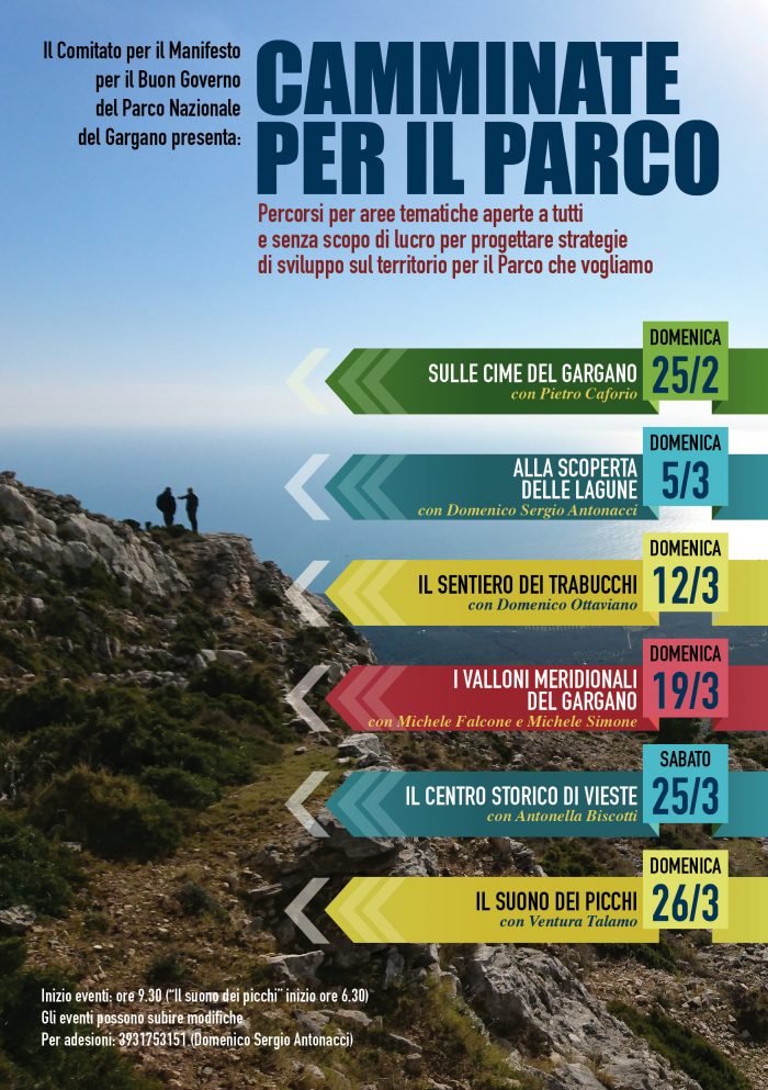 Il Comitato del Manifesto per il Buon governo del Parco nazionale del Gargano presenta “Camminate per il Parco”:Sei appuntamenti tematici aperti a tutti per conoscere meglio il nostro Parco e per parlare di strategie di sviluppo. Dopo l’ottimo riscontro avuto dopo la presentazione del manifesto a Vico del Gargano, il 28 gennaio scorso, e dopo l’incontro presso la Comunità dei sindaci a Monte Sant’Angelo il 5 febbraio ecco una nuova iniziativa dal basso per coinvolgere la società civile. “Spesso conosciamo poco il nostro patrimonio e con queste Camminate per il Parco – organizzate grazie alla disponibilità a titolo gratuito di diverse guide e amanti del nostro territorio – avremo la possibilità di lavorare sul campo per condividere idee di tutela e sviluppo”. Dalla Foresta Umbra alle lagune del Gargano, passando per l’ambiente costiero, valli e boschi, spostando l’attenzione dai centri storici fino al delicato equilibrio della fauna che frequenta gli ambienti più remoti del promontorio, si passerà mezza giornata tra natura e storia conoscendo alcuni dei luoghi simbolo del Parco Nazionale del Gargano. Il primo appuntamento è fissato al 26 febbraio e vedrà protagonista Monte Castellana, poco a sud di San Giovanni Rotondo, dove la guida AIGAE Pietro Caforio condurrà i partecipanti in un ambiente caratterizzato da forme carsiche, boschi e resti di strutture in pietra utilizzate dai pastori. Le lagune del Gargano saranno al centro della giornata del 5 marzo quando la guida Domenico Antonacci porterà al centro della discussione l’equilibrio tra attività antropiche e laghi in un percorso storico che parte dall’antichità per arrivare fino ai giorni nostri. Il 12 marzo Domenico Ottaviano, giovane trabucchista, vi farà conoscere l’arte secolare dei trabucchi attraverso un percorso che segue la linea costiera tra Peschici e Vieste dove sarà possibile osservare anche diverse torri d’avvistamento cinquecentesche e alcuni siti archeologici tra i quali il villaggio del bronzo di Punta Manaccora e le incisioni rupestri di Sfinalicchio. Sarà l’occasione per riflettere sulla gestione della costa e dei suoi elementi naturali e antropici. Il delicato habitat della Foresta Umbra sarà protagonista domenica 19 marzo con Matteo Falcone, guida AIGAE, che accompagnerà il percorso di conoscenza del Gargano nel suo mostrando quali sono i fragili equilibri tra uomo e ambiente in una delle foreste più importanti d’Italia. Sabato 24 marzo sarà la volta del centro storico di Vieste dove con Antonella Biscotti, tra i fondatori di della DMO “MAT Destination”, occasione per aprire delle riflessioni sugli interventi di cui i nostri centri storici necessitano per recuperare l’aspetto autentico e originario di una volta. L’ultimo appuntamento è previsto per il 26 marzo con “Il suono dei picchi”, a cura di Ventura Talamo, esperto ornitologo, con il fine di conoscere e rispettare gli abitanti dei boschi. Una suggestiva esperienza di ascolto del suono dei picchi nel bosco di Fajarama di San Marco in Lamis. Partenza prevista per le 6.00 del mattino dal Convento di San Matteo per un’insolita sveglia nella natura. Le adesioni potranno essere comunicate al 3931753151 mentre descrizioni più dettagliate delle camminate saranno disponibili sul gruppo Facebook Un Manifesto per il Parco Nazionale del Gargano. Il comitato organizzatore precisa che l’iniziativa non è a scopo di lucro e che le guide non si assumono alcuna responsabilità riguardo a eventuali infortuni.