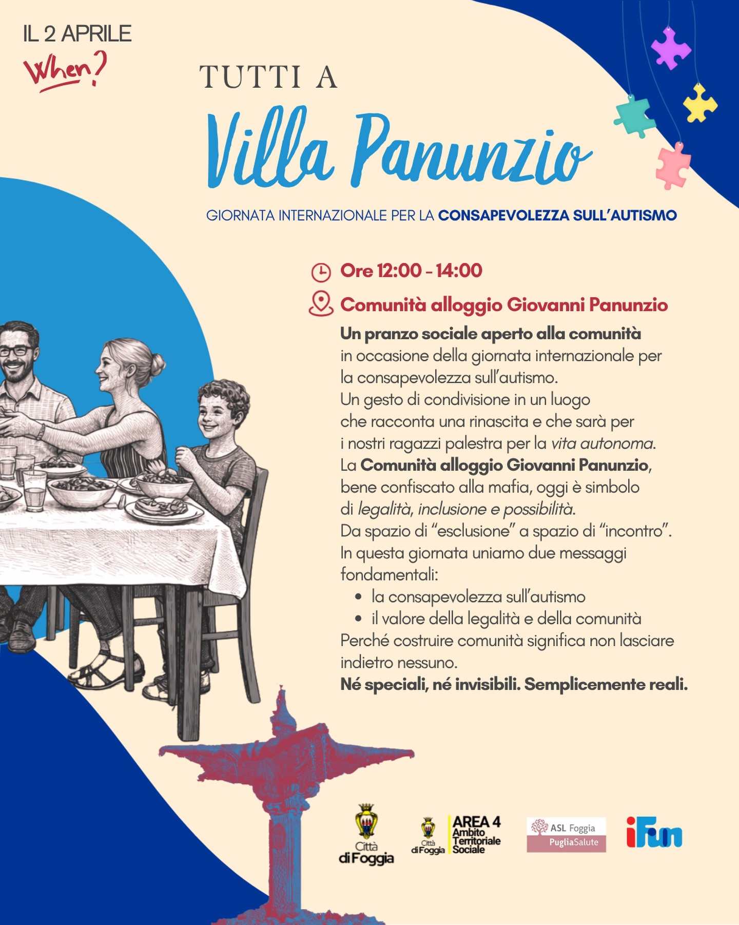 Con questo spirito, in occasione della Giornata Mondiale della Consapevolezza sull’Autismo, che si celebra il 2 aprile 2026, i ragazzi dell’Associazione iFun prepareranno un pranzo sociale. Un momento conviviale, organizzato nell’immobile confiscato alla criminalità organizzata, in via delle Orchidee, in località Posta Conca, restituito alla collettività e diventato Comunità alloggio intitolata all’imprenditore Giovanni Panunzio e a tutte le vittime della mafia per essere spazio di crescita e inclusione.