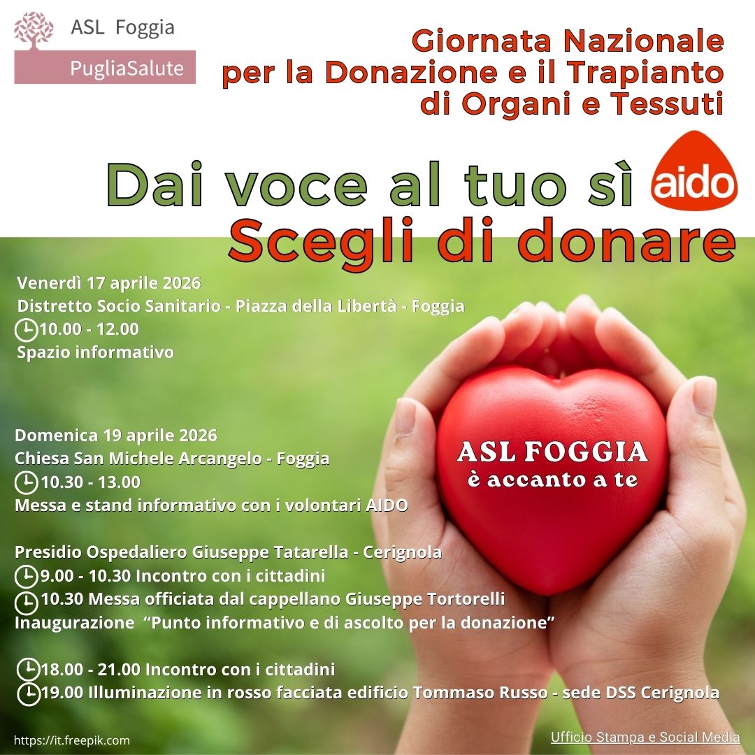 ASL Foggia, in vista della Giornata Nazionale per la Donazione e il Trapianto di Organi e Tessuti che si celebra il 19 aprile 2026, promuove iniziative di informazione e sensibilizzazione sull’importanza di compiere una scelta libera e solidale, in linea con la campagna promossa dal Ministero della Salute.