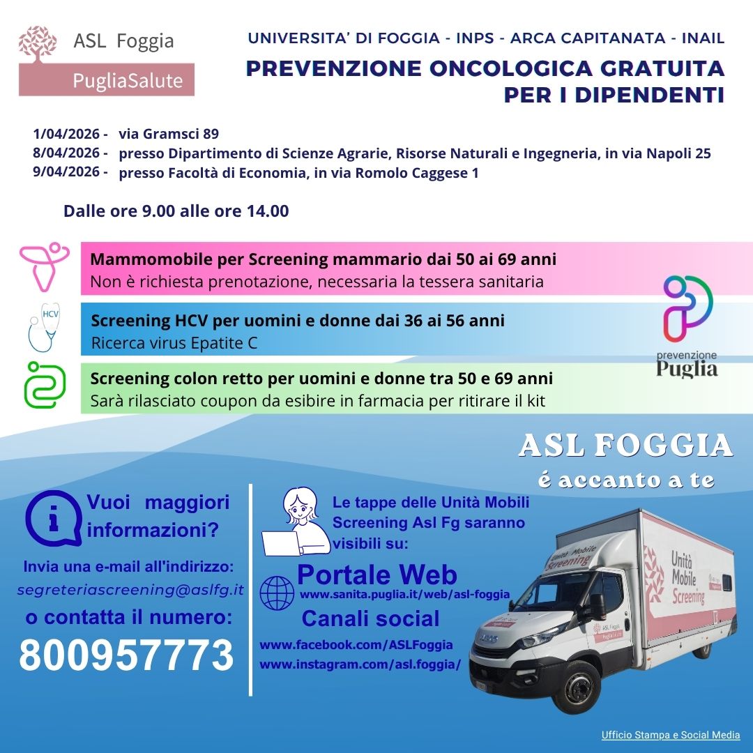 Riparte il programma di prevenzione oncologica gratuita nei luoghi di lavoro promosso da ASL Foggia. Tre le giornate di screening, organizzate nel mese di aprile, per dipendenti dell’Università degli Studi di Foggia, Inps, Arca Capitanata e Inail, con l’ausilio del Mammomobile.