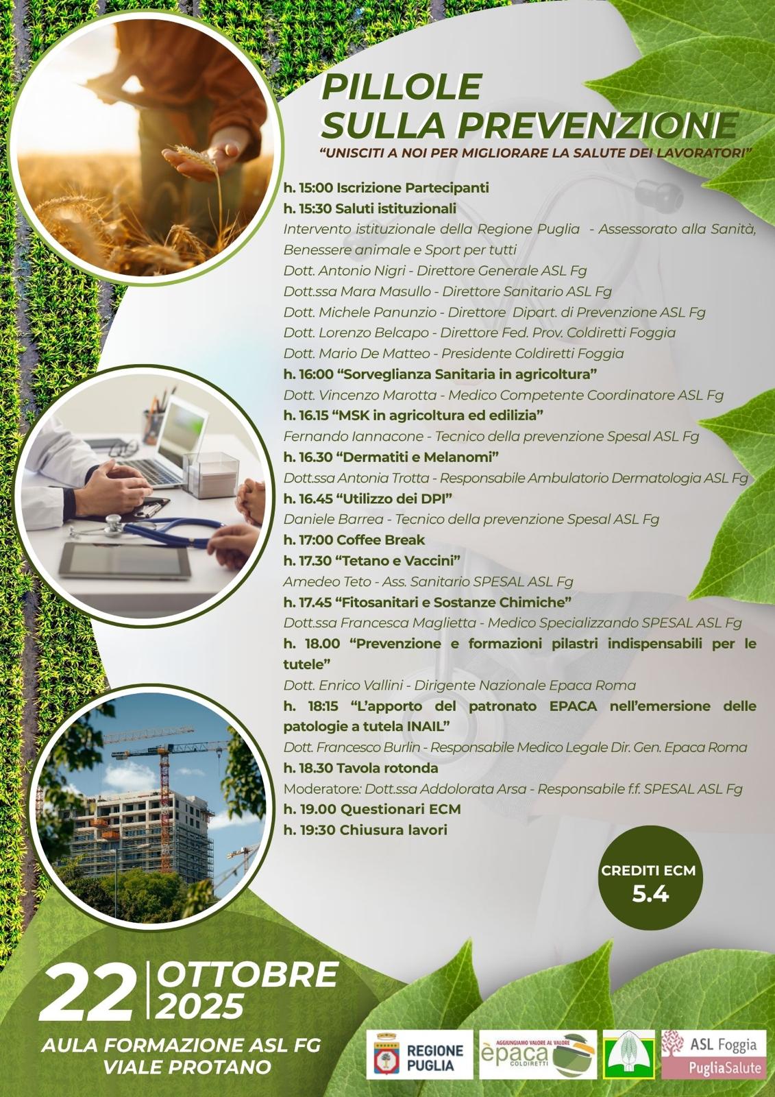 Promuovere la cultura della sicurezza partendo dalla prevenzione, attraverso un percorso formativo rivolto a imprese e operatori. Con questo obiettivo parte il progetto “Pillole sulla Prevenzione – Uniti per migliorare la salute dei lavoratori”, promosso dal Servizio di Prevenzione e Sicurezza negli Ambienti di Lavoro (SPESAL) di ASL Foggia e realizzato in collaborazione con Regione Puglia, Coldiretti ed Epaca (Ente di patrocinio e assistenza per i cittadini e l’agricoltura).