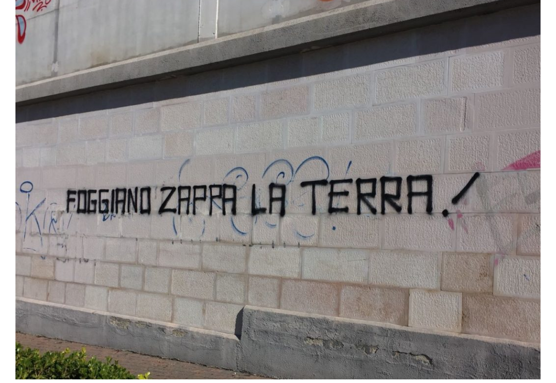 Bari- Come nelle peggiori curve degli stadi italiani, sul muro del sottopassaggio Duca degli Abruzzi, nei pressi della chiesa Sant’Antonio, è stata incisa un’ennesima scritta spray. Questa volta si tratta di insulto di origine territoriale: “Foggiano zappa la terra”.