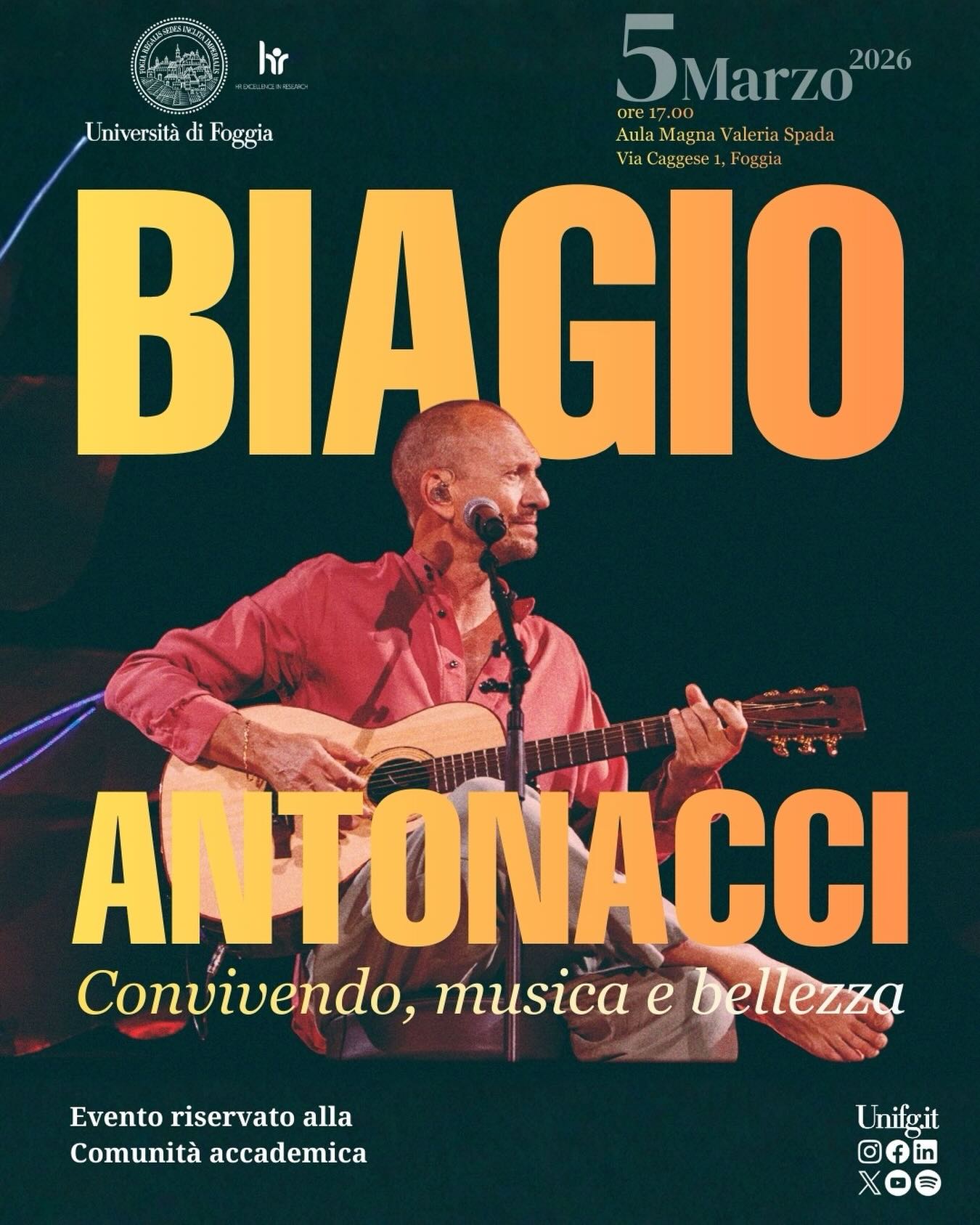 Tra i cantautori italiani Biagio Antonacci è sicuramente uno dei più apprezzati e amati dal pubblico. “Convivendo, musica e bellezza” (questo il titolo dell’incontro) sarà un viaggio nel percorso umano e artistico del cantautore e un’occasione unica per l’intera comunità dell’Università di Foggia.