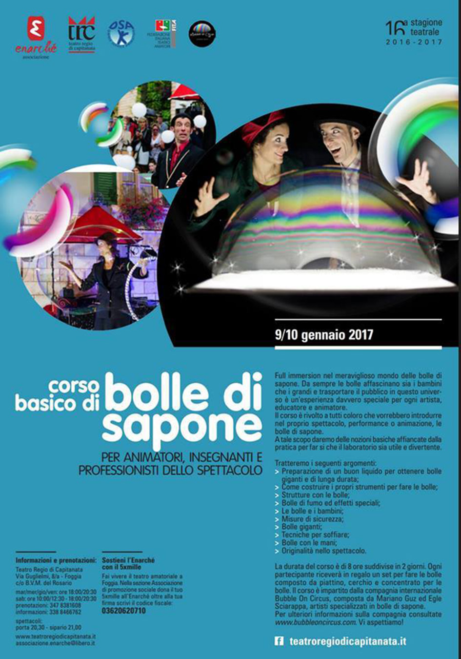 Sono quasi invisibili, più leggere di una piuma e durano pochi istanti, eppure le bolle di sapone hanno un loro fascino senza tempo, catturano gli occhi e il cuore di bambini e adulti: il 9 e 10 gennaio 2017 al Teatro Regio di Capitanata di Foggia (in via Guglielmi, 8 a – c/o Chiesa Madonna del Rosario), nell’ambito della 16a stagione teatrale Enarché, si terrà un Corso basico di Bolle di sapone. Il corso, delladurata di 8 ore, è rivolto in particolare ad animatori, insegnanti e professionisti dello spettacolo: a insegnare le tecniche base di questa “trasparente” arte saranno Mariano Guz ed Egle Sciarappa, bravissimi artisti della compagnia Bubble on Circus. Il corso, che si comporrà di una parte teorica e di una pratica nella forma di laboratorio, affronterà vari temi: la preparazione del liquido, le bolle di fumo e gli effetti speciali, le bolle di sapone e i bambini, le tecniche per soffiare, la sicurezza, le strutture con le bolle. Ogni partecipante al laboratorio riceverà un set completo per creare le bolle di sapone.