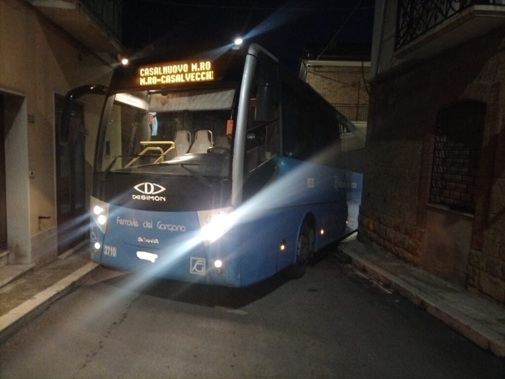 La variazione dell’itinerario è stata disposta dal Comune di Casalnuovo M. per permettere l’esecuzione di lavori lungo il tradizionale percorso. Un disservizio, dicono gli autisti di Ferrovie del Gargano, preannunciato. Personale della società di trasporti, infatti, avrebbe fatto rilevare al Comune che la strada alternativa non avrebbe permesso il passaggio ai mezzi poiché stretta in un tratto.