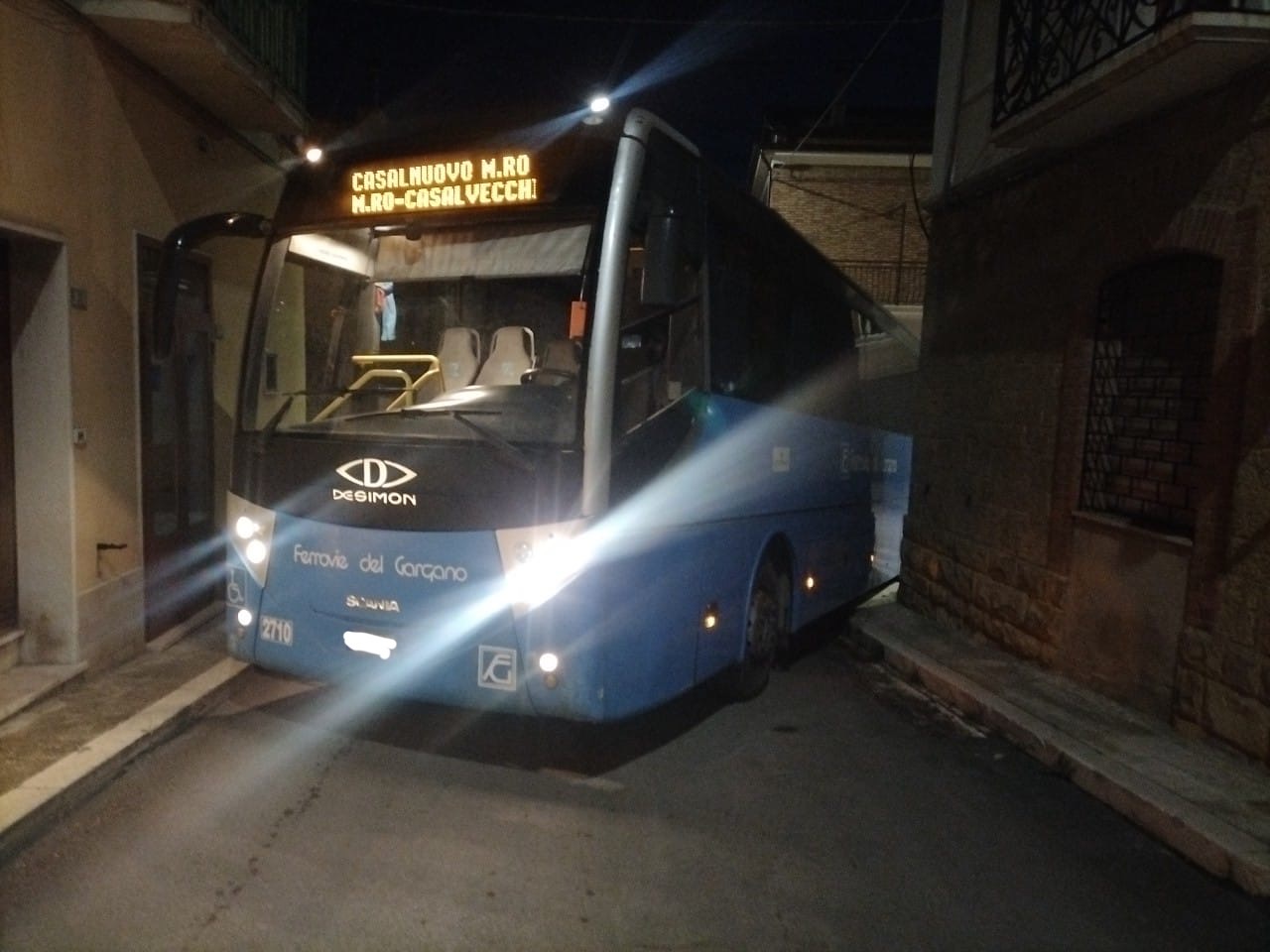 A Casalnuovo Monterotaro, questa mattina, un bus di Ferrovie del Gargano, questa mattina, è rimasto incastrato tra due palazzi. Nel piccolo Comune dei Monti Dauni, il mezzo di linea percorrendo la strada alternativa al solito tragitto è rimasto incastrato in una curva troppo stretta per permetterne il passaggio. Risultato: a terra oltre duecento persone poiché tutti gli altri bus di Ferrovie del Gargano sono stati costretti a fermarsi. I mezzi sono