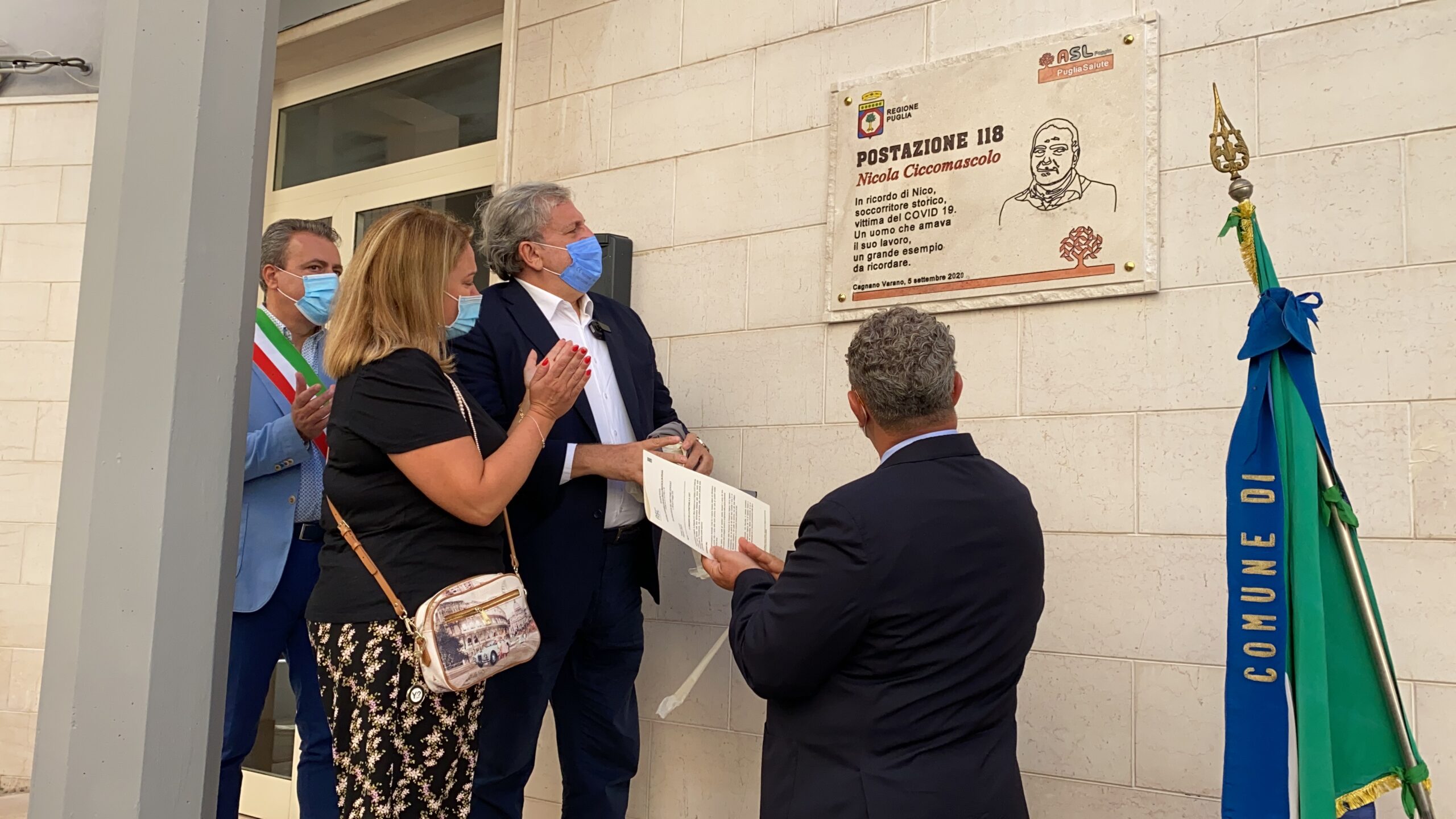 Cerimonia di intitolazione della Postazione di Emergenza Territoriale 118 di Cagnano Varano e della sua ambulanza a Nicola Ciccomascolo, il soccorritore che nella provincia di Foggia ha perso la vita lo scorso marzo dopo aver contratto il coronavirus nel corso di un intervento di emergenza.