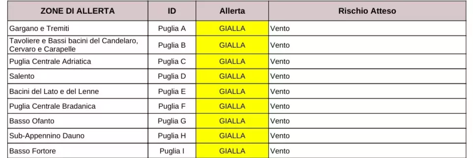 Il dipartimento della protezione civile ha emesso per la Puglia l’allerta con validità dalla prossima mezzanotte per venti ore. Si prevedono “venti da forti a burrasca dai quadranti meridionali, in graduale attenuazione dalla serata.”