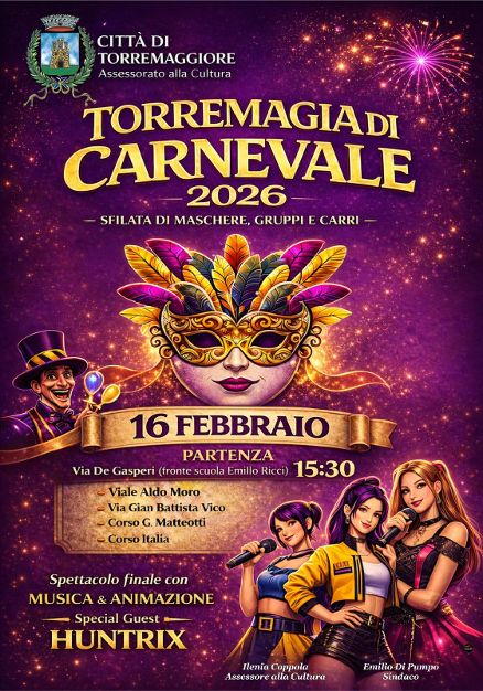 Il Carnevale a Torremaggiore si svolgerà Lunedì 16 febbraio, ore 15:30, con il raduno dei carri allegorici e dei gruppi mascherati.