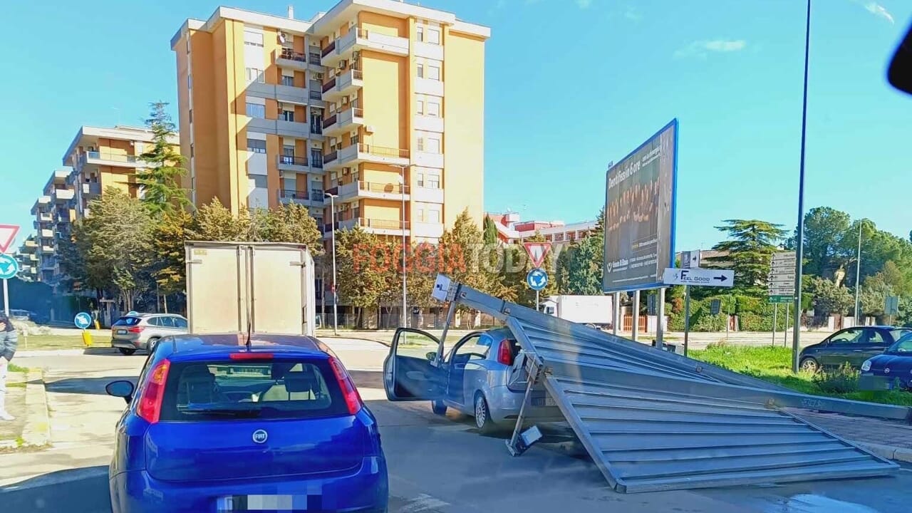 Momenti di paura questa mattina a Foggia, in Via Tratturo Camporeale, quando a causa del forte vento che in queste ore sta colpendo la città, un cartellone pubblicitario si è abbattuto al suolo, colpendo un’automobile che transitava in quel momento.
