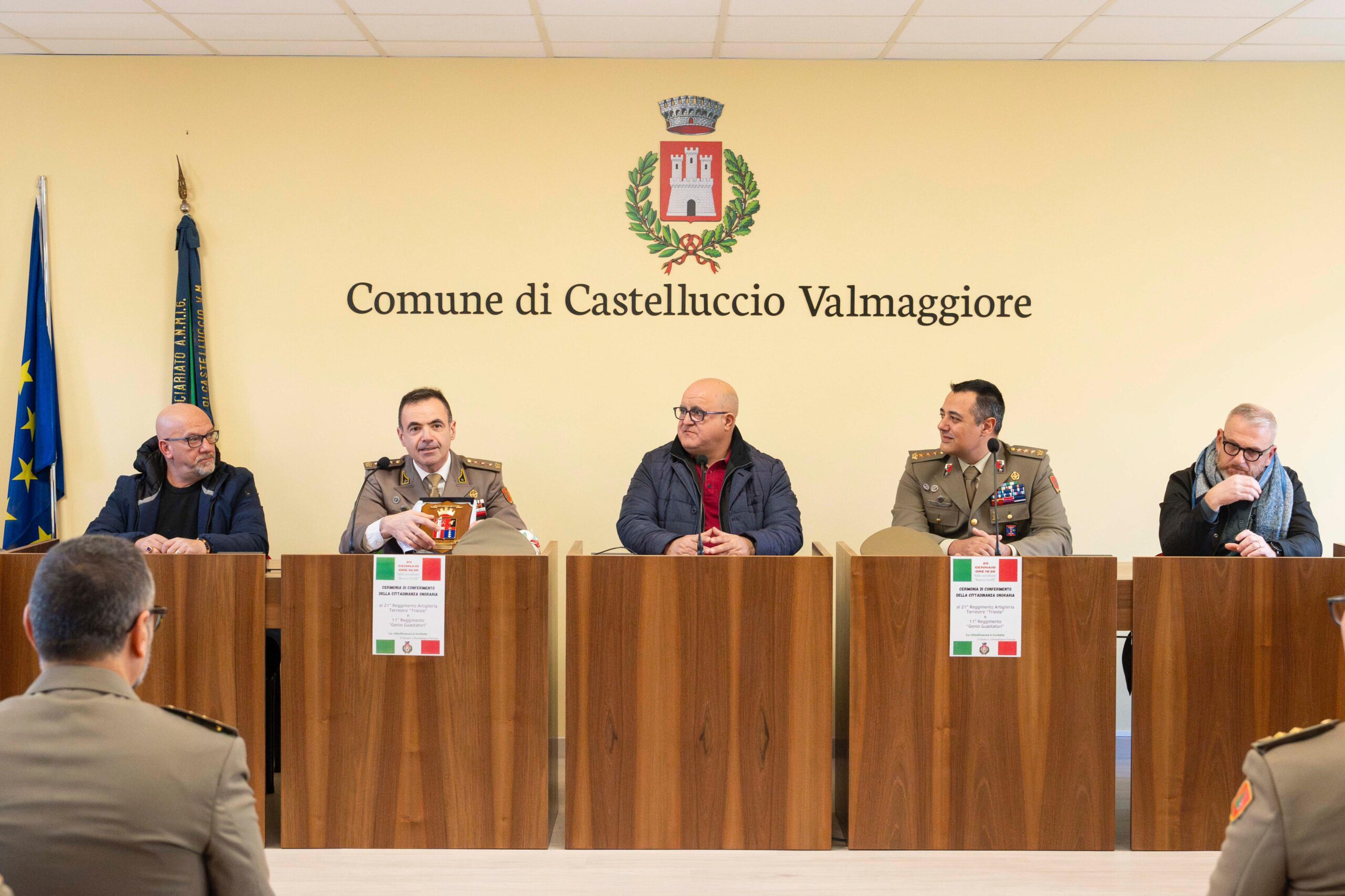 Con una breve cerimonia nell’Aula Consiliare del comune, il Sindaco di Castelluccio Valmaggiore, Pasquale Marchese, congiuntamente all’amministrazione comunale, ha conferito al 21° Reggimento Artiglieria Terrestre “Trieste” e all’11° Reggimento Genio Guastatori, unità dell’Esercito alle dipendenze della Brigata Meccanizzata “Pinerolo”, la cittadinanza onoraria a testimonianza dell’impegno e dell’abnegazione mostrata dai reggimenti sul territorio dauno.