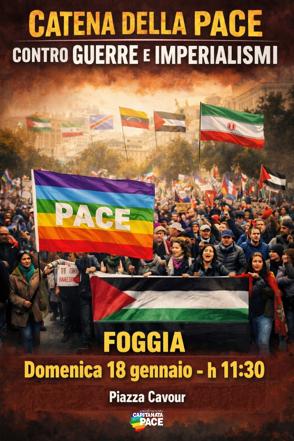 “Una “Catena della Pace” per denunciare la demolizione del diritto internazionale, il ritorno degli imperialismi e il ripudio della guerra come strumento di risoluzione dei conflitti. È l’iniziativa lanciata dal Coordinamento provinciale Capitanata per la Pace, che chiama a raccolta cittadine e cittadini, associazioni e organizzazioni sindacali domenica 18 gennaio, dalle ore 11:30, con partenza da Piazza Cavour (lato via V. Lanza) e chiusura in Piazza U. Giordano. L’invito è a partecipare esponendo bandiere e cartelli pacifisti.