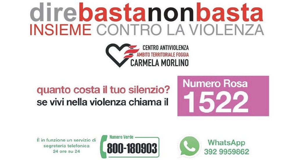 Foggia – Sono giorni di ansia e preoccupazione, per tutto il Paese, a causa dell’emergenza da CoVid-19. Ma, oggi, non possiamo dimenticare un altro ‘virus’ che, da troppo tempo, continua a propagarsi in Italia e nel mondo: la violenza di genere contro le donne. Si tratta di un problema epidemico, globale, trasmissibile, contagioso, che può essere letale. “direbastanonbasta” non è, soltanto, un monito ma è il titolo della campagna di sensibilizzazione della quale, il Centro Antiviolenza – Ambito Territoriale Foggia – ‘Carmela Morlino’ si fa promotore in occasione della Giornata internazionale dei diritti della donna.