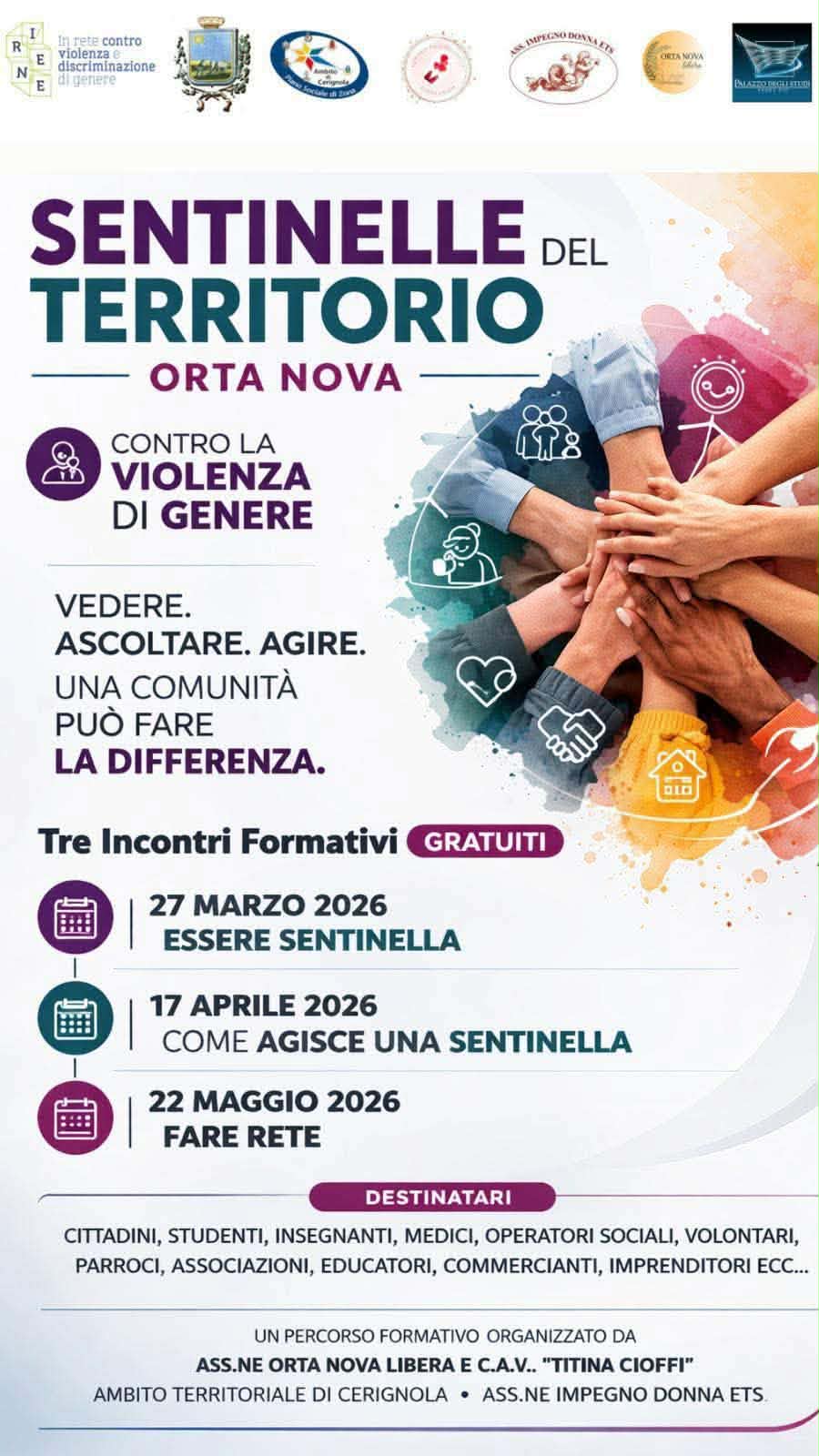 Il progetto, fortemente voluto e sostenuto dal Comune di Orta Nova attraverso l’Assessora alla Legalità Vittoria Mastrogiacomo e l’Assessore al Welfare Sebastiano Battista nasce con un obiettivo chiaro: formare la comunità Ortese affinché il maggior numero possibile di persone riescano a riconoscere i segnali della violenza di genere e offrire un primo supporto alle vittime. Un’iniziativa che ha trovato terreno fertile nelle associazioni, scuole, parrocchie, fra imprenditori e imprenditrici e attività commerciali.