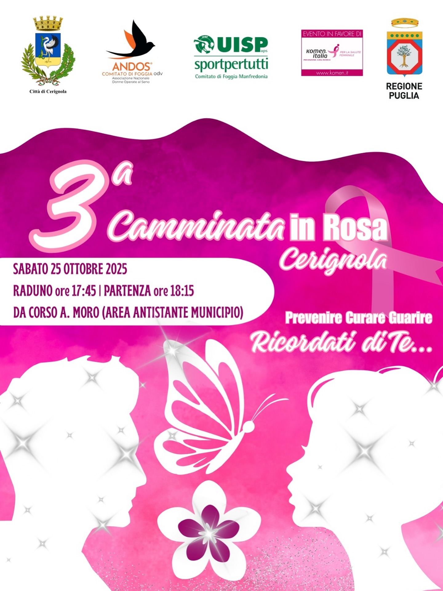 Sabato 25 ottobre, a partire dalle ore 17:45, sarà la volta di Cerignola: in città si svolgerà la terza edizione della Camminata in Rosa. Il raduno è previsto in Corso Aldo Moro, nei pressi di Palazzo di Città. L’iniziativa, patrocinata dal Comune di Cerignola, è organizzata in collaborazione con l’Uisp – Comitato territoriale Foggia Manfredonia Aps guidato da Annunziata Zorretti, con Andos Comitato di Foggia e Komen Puglia.