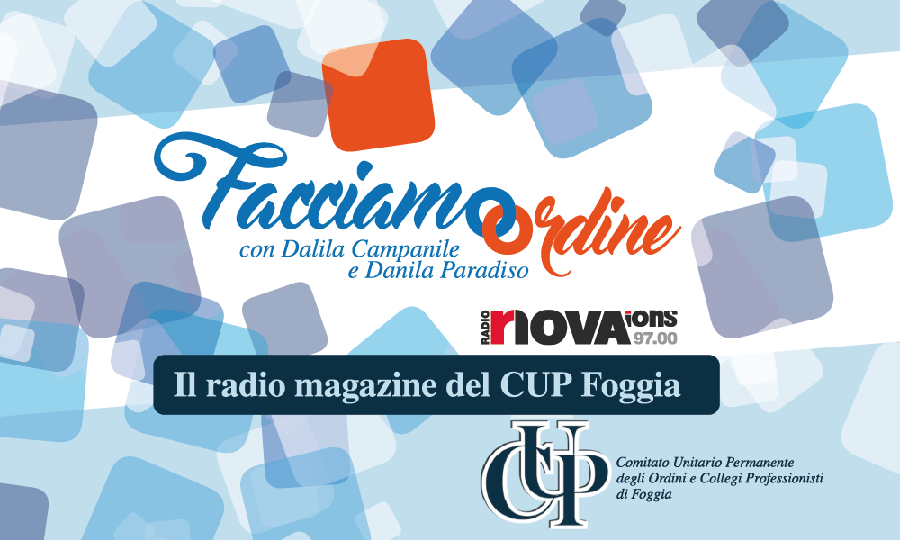 Il radio magazine del CUP Foggia, recita il payoff, ossia il Comitato Unitario Permanente degli Ordini e dei Collegi Professionali. Si tratta di un’associazione costituita fra le rappresentanze istituzionali di livello locale degli Ordini e Collegi professionali. Non ha fini di lucro e rappresenta, in conformità alle norme istitutive degli enti associati e nel pieno rispetto dell’autonomia di ciascuno, le professioni liberali italiane.