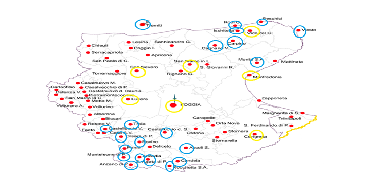 La figura sottostante rappresenta la distribuzione delle strutture ASL Foggia: in giallo i comuni sede di farmacia territoriale e in blu i comuni con un punto di distribuzione di farmaci.