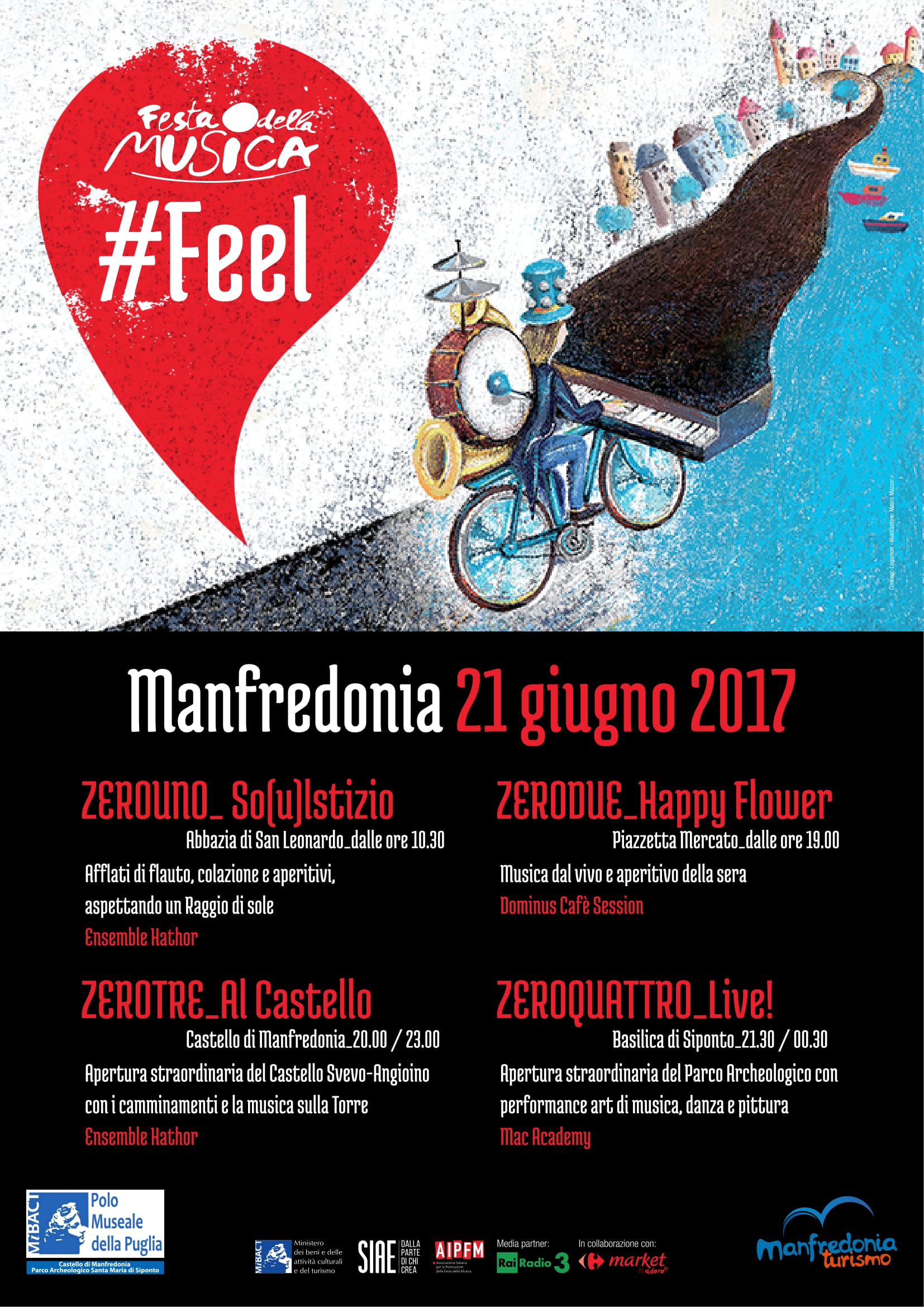 L’evento nazionale, organizzato da MIBACT, Siae e AIPFM (Associazione Italiana per la Promozione della Festa della Musica), ha l’intento di trasmettere un messaggio di cultura, partecipazione, integrazione, armonia e universalità attraverso l’arte e le note. Il nome del programma di eventi ‘diffusi’ a Manfredonia, prende simbolicamente il nome “#Feel”, sentire, con il duplice significato di ascoltare e sentire, sintonizzarsi in simbiosi con la città, il territorio.
