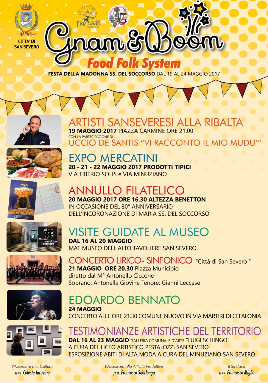 La rassegna “Gnam&Boom”, voluta dall’Amministrazione Comunale, propone una serie di iniziative per animare la Festa del Soccorso e promuovere il territorio. “Si intende affiancare per la seconda volta – dichiara il Sindaco Miglio – le tradizioni religiose a quelle folkloristiche proposte da sempre nell’ambito dei festeggiamenti in onore della nostra Celeste Patrona. Si tratta di una serie di variegate iniziative che bene si integrano accanto a quelle tradizionali proposte dal Comitato Festa, dall’Arciconfraternita e da tutte le altre associazioni che collaborano da sempre ai festeggiamenti”.