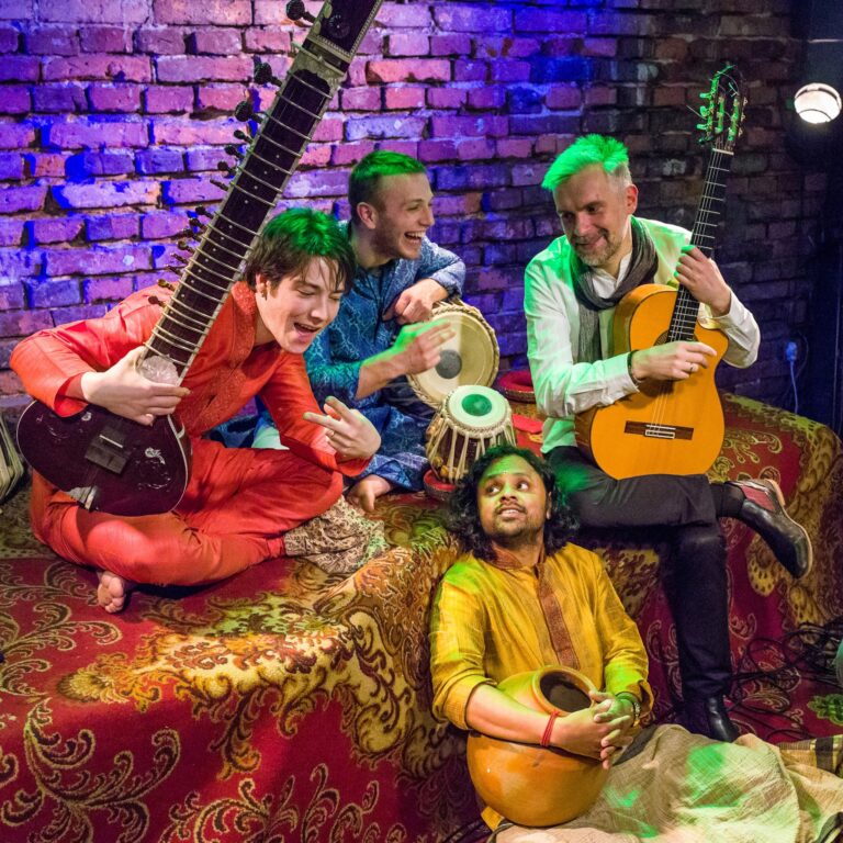Sul palco, un ensemble di virtuosi: Miguel Czachowski, chitarrista flamenco di origini polacche, ideatore e cuore pulsante del progetto Indialucia. Accanto a lui Leo Vertunni al sitar, un musicista italiano con una straordinaria padronanza di questo strumento iconico della musica classica indiana, capace di tessere