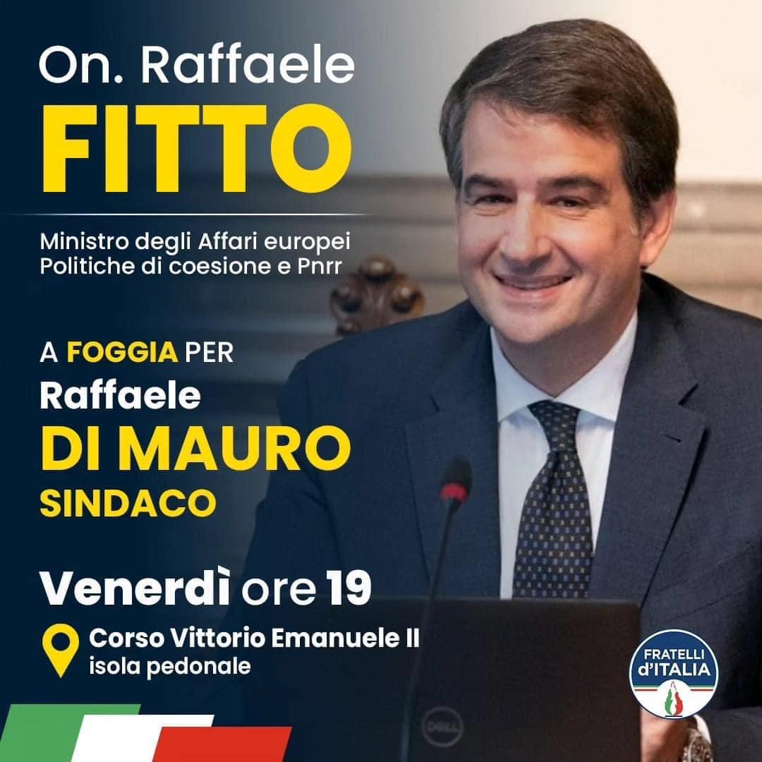 Domani, venerdì 20 ottobre, il ministro agli Affari Europei, Sud, PNRR e Politiche di Coesione, Raffaele Fitto sarà a Foggia per un doppio appuntamento