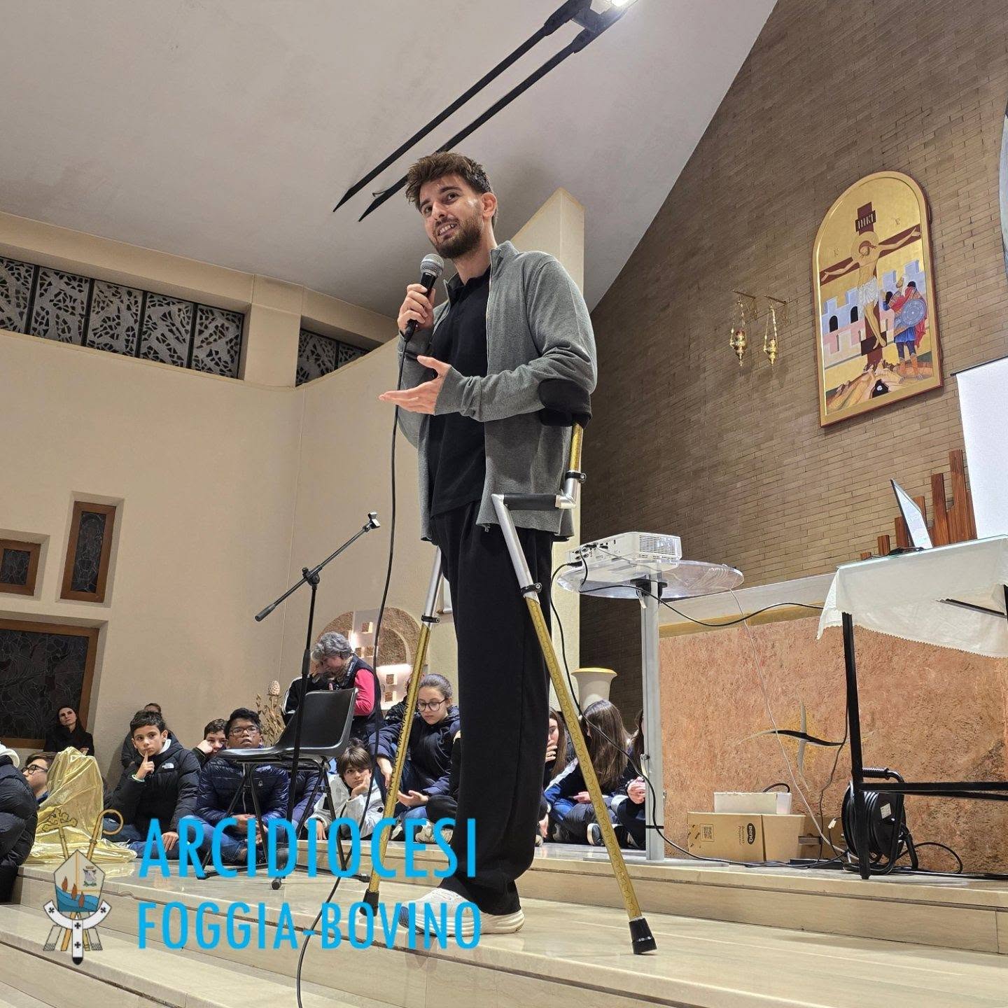 FOGGIA – Oltre 800 giovani, provenienti da tutte le parrocchie e realtà ecclesiastiche del territorio, si sono radunati nella parrocchia dei Santi Guglielmo e Pellegrino di Foggia per celebrare la Giornata Mondiale della Gioventù diocesana. A ciascun partecipante è stato consegnato un bracciale fluo, delle caramelle e un foglietto di carta su cui era stampato un versetto tratto dalla Bibbia. Un momento di festa, oltre che di preghiera, scandito da canti e balli e caratterizzato dalla testimonianza del calciatore Arturo Mariani (fondatore e capitano della Asd Roma Calcio Amputati) e dalla riflessione dell’Arcivescovo Ferretti.