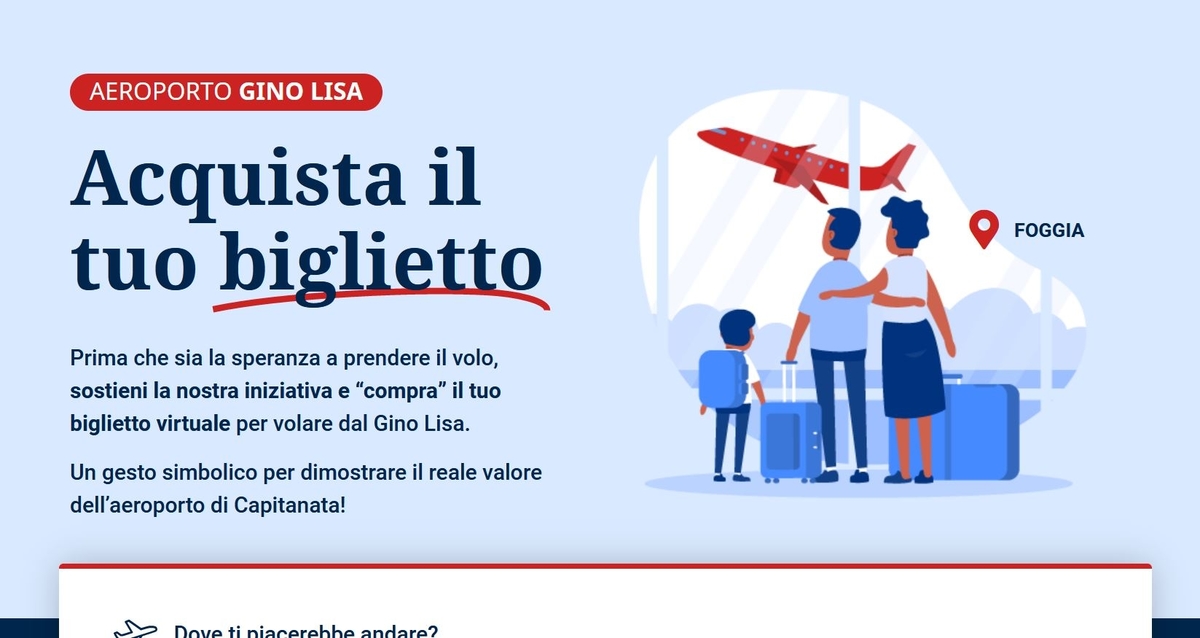Foggia – Negli ultimi giorni l’iniziativa lanciata dalla deputata foggiana Rosa Menga sta facendo molto chiacchierare e ha chiamato all’azione i foggiani e tutti gli abitanti della provincia per “acquistare” un biglietto virtuale con partenza dall’aeroporto di Gino Lisa.