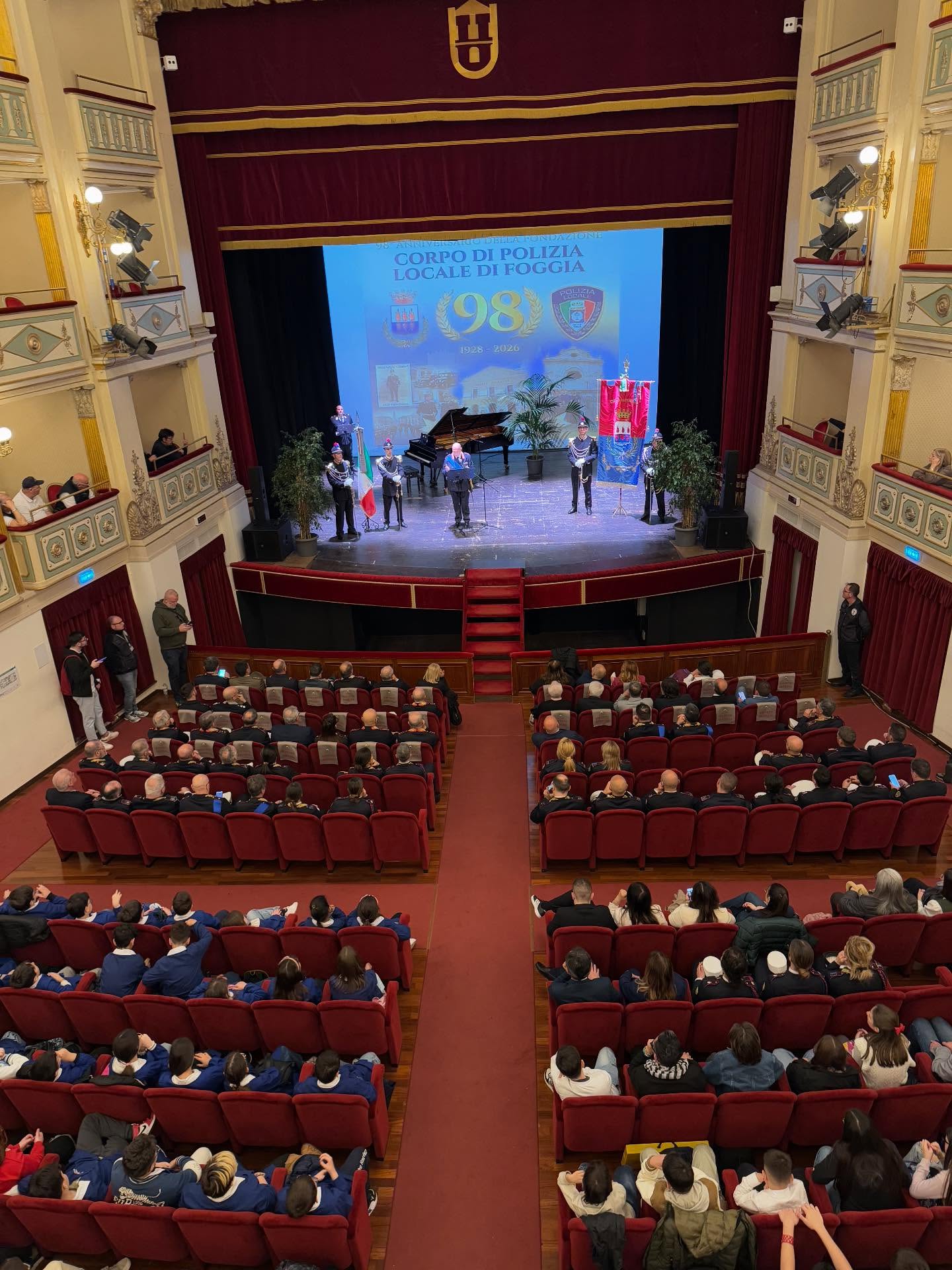FOGGIA – Si è svolta presso il Teatro Umberto Giordano la cerimonia ufficiale per il 98° anniversario della fondazione del Corpo di Polizia Locale di Foggia. All’iniziativa hanno preso parte la Sindaca Maria Aida Episcopo, gli Assessori Daniela Patano, Domenico Di Molfetta, Giuseppe Galasso, Lorenzo Frattarolo, Giulio De Santis e Davide Emanuele, insieme alle autorità civili e militari, a testimonianza della forte sinergia tra istituzioni nella tutela della sicurezza e della legalità sul territorio.