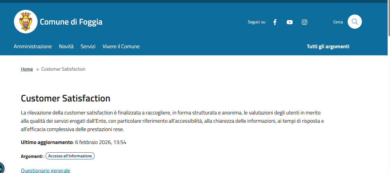 FOGGIA – Sul sito istituzionale del Comune di Foggia è stata istituita un’apposita sezione, denominata “Customer satisfaction”, finalizzata a raccogliere, in forma strutturata ed anonima, le valutazioni degli utenti in merito alla qualità dei servizi erogati dall’Ente, con particolare riferimento all’accessibilità, alla chiarezza delle informazioni, ai tempi di risposta e all’efficacia complessiva delle prestazioni rese.