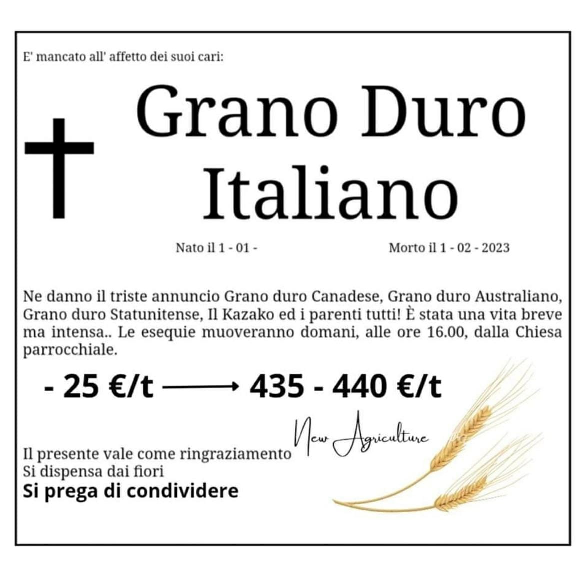 Tanto che i cerealicoltori foggiani, esasperati, sui social hanno diffuso il manifesto funebre: “E’ mancato all’affetto dei suoi cari il Grano Duro Italiano: ne danno il triste annuncio grano duro canadese, grano duro australiano, grano duro statunitense, il kazako e i parenti tutti”. La stessa situazione si è verificata alla Borsa Merci di Bari, dove martedì le quotazioni del grano duro hanno registrato un “meno 17 euro” alla tonnellata.