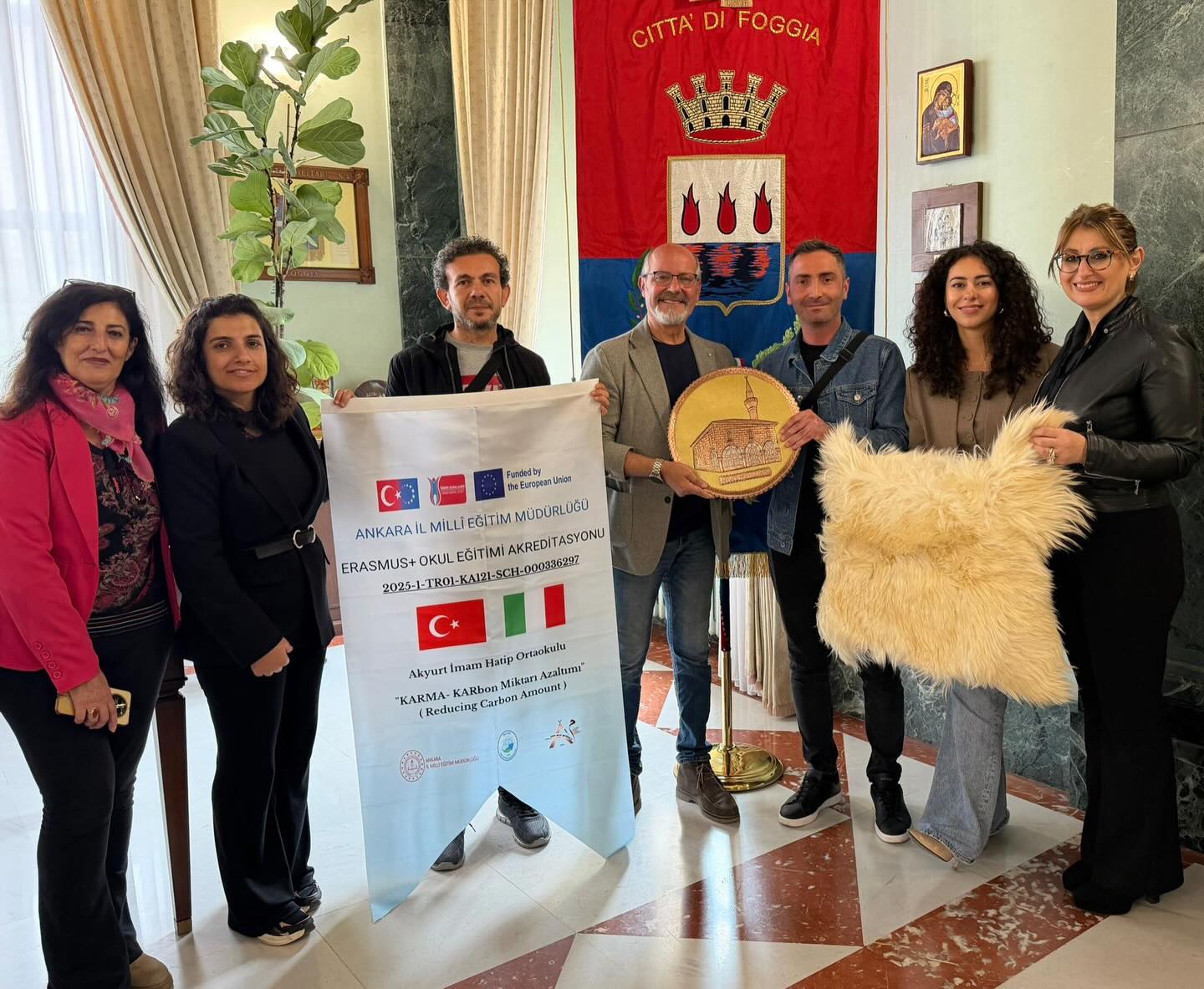 FOGGIA – Ieri mattina una delegazione di docenti provenienti da Akyurt, uno dei distretti della provincia di Ankara – a Foggia per un progetto Erasmus condiviso con l’Istituto Comprensivo Foscolo-Gabelli – è stata ricevuta a Palazzo di Città dall’assessore alla Pubblica Istruzione Domenico Di Molfetta e dall’assessora alla Cultura e alle Politiche giovanili Alice Amatore. Era composta dai professori Ahmet Erkol, Murvet Simsek e Ali Osman Er, accompagnati da Carolina Ragone e dalla referente Erasmus dell’istituto, Antonella D’Angelo. Hanno consegnato due doni della sindaca Hilal Ayik per la sindaca Maria Aida Episcopo, a suggello della vicinanza delle rispettive comunità e volontà di costruire relazioni e rapporti duraturi. Particolarmente apprezzato in particolare il vello, che riveste un ruolo peculiare nella cultura, nella storia, nell’artigianato e nella tradizione dell’Anatolia.