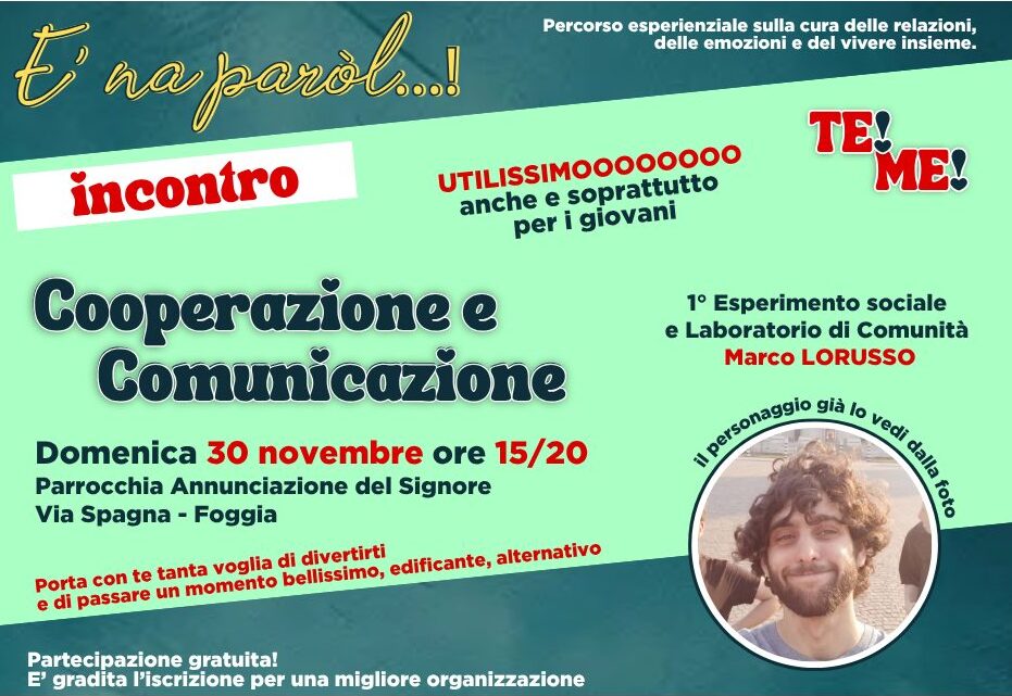 gioco, di sperimentare e scoprire i segreti (e i tranelli) della comunicazione. Un evento unico, un esperimento sociale interattivo, combinato con un laboratorio di comunità dinamico e divertente per esplorare insieme ad un esperto come comunichiamo, cosa non funziona e come possiamo migliorare le nostre interazioni quaotidiane in modo leggero e coinvolgente. Sarà anche un modo per fare nuove amicizie, generare nuove relazioni e costruire nuovi legami”, continua il presidente Ugo Ferrantino.