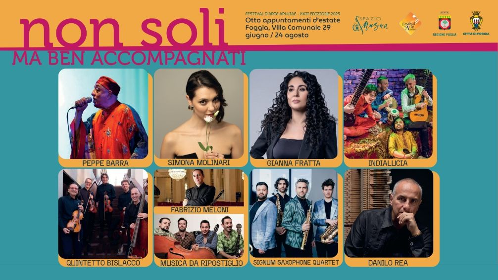 FOGGIA – Il cartellone estivo della città di Foggia torna ad impreziosirsi degli otto appuntamenti della XXII edizione del “Festival d’Arte Apuliae – Non soli, ma ben accompagnati”, la rassegna organizzata dall’associazione Spazio Musica, con la direzione del M° Dino De Palma, che annualmente torna ad animare otto domeniche d’estate alla Villa Comunale del capoluogo.