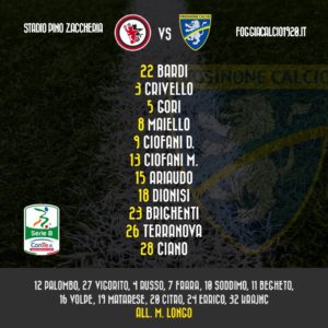 Frosinone (3-4-1-2): Bardi; Brighenti, Ariaudo, Terranova; M. Ciofani, Maiello, Gori, Crivello; Ciano; D. Ciofani, Dionisi