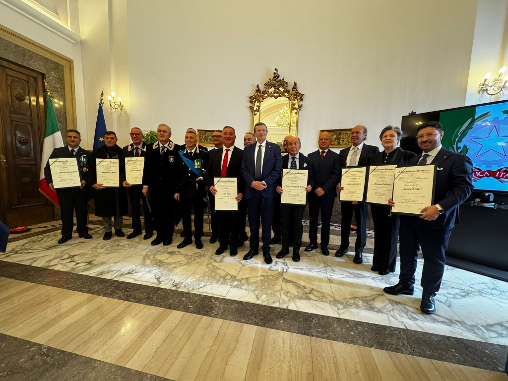 FOGGIA – Si è tenuta questa mattina, in Prefettura, la Cerimonia di consegna dei diplomi delle onorificenze “Al Merito della Repubblica Italiana”, conferite dal Presidente della Repubblica a 16 cittadini residenti nella Provincia di Foggia che si sono distinti nel disimpegno di pubbliche cariche e di attività svolte a fini sociali, filantropici ed umanitari, nonché per lunghi e segnalati servizi nelle carriere civili e militari.