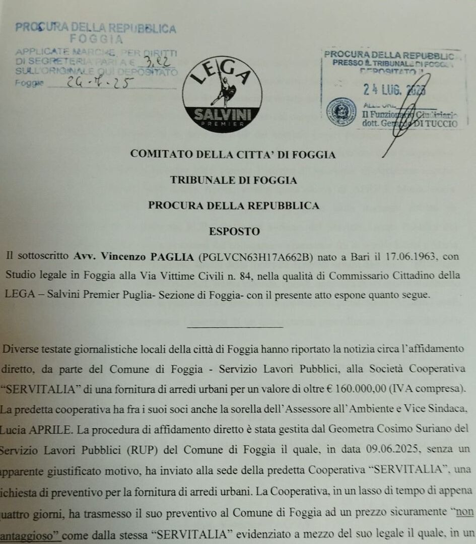 FOGGIA – Il commissario cittadino della Lega Vincenzo Paglia, d’intesa con il commissario provinciale Joseph Splendido, ha depositato, in data odierna un esposto alla Procura della Repubblica sulla vicenda del vice Sindaco Aprile.
