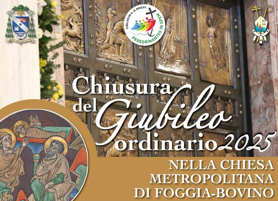 FOGGIA – A conclusione dell’Anno Santo 2025, come disposto da Papa Francesco con la bolla “Spes non confundit”, domenica 28 dicembre alle ore 18:00, con una solenne celebrazione eucaristica stazionale nella basilica Cattedrale di Foggia, l’Arcivescovo di Foggia – Bovino Ferretti chiuderà il Giubileo Ordinario 2025 a livello diocesano.