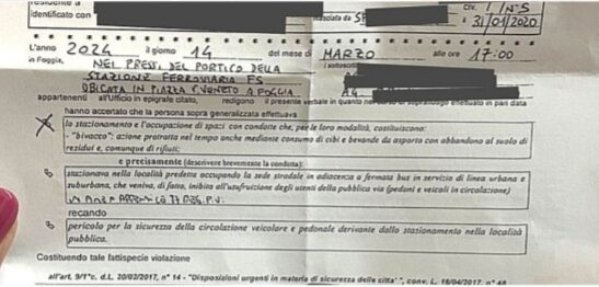 E’ polemica sulla multa da 100 euro comminata della polizia locale di Foggia a un senzatetto straniero che si era sistemato per trascorrere la notte all’addiaccio nei pressi della stazione ferroviaria di Foggia. Durante i controlli al Quartier Ferrovia gli agenti della polizia locale hanno multato il senzatetto, portando via anche alcune coperte utilizzate dai senza tetto come riparo per chi passa la notte in quella zona. «Multare i poveri, che hanno la sola responsabilità di vivere per strada, non è un buon modo di riqualificare il quartiere Ferrovia. Lo troviamo solo un gesto di inumanità», commenta Claudio De Martino, volontario dei Fratelli della Stazione e avvocato di strada. «Se il ragazzo vorrà – prosegue il legale – prepareremo gli scritti difensivi per fare ricorso contro la multa. Però riteniamo che, in questa città, ci sono cose più importanti che multare chi vive nella povertà. In questa città attendiamo che si pensi a trovare una situazione più adeguata a chi vive nella povertà e nell’emarginazione. Ribadiamo – conclude De Martino – il nostro appoggio incondizionato alla polizia locale e a tutte le forze dell’ordine che ogni giorno lavorano per il bene del nostro territorio. Ma bisogna evidenziare che la povertà non è un reato».