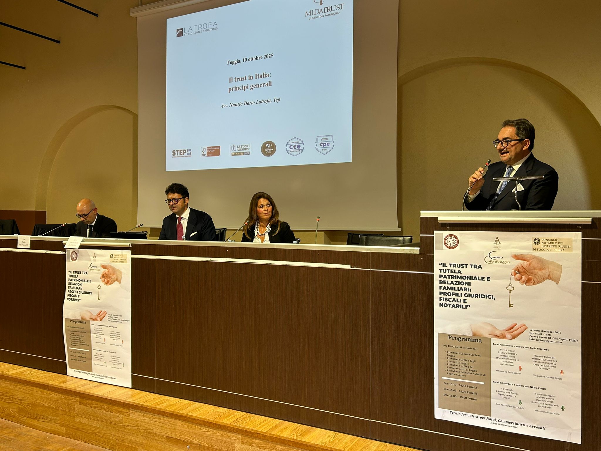 FOGGIA – Oltre 100 professionisti, tra avvocati, commercialisti e notai, hanno partecipato all’evento formativo di venerdì 10 ottobre organizzato dalla Camera Civile di Foggia, in collaborazione con l’Ordine dei Commercialisti, l’Ordine degli Avvocati e il Consiglio Notarile dei Distretti riuniti di Foggia e Lucera. Nella sala conferenze di Formedil, a Foggia, si sono ritrovati per approfondire la conoscenza interdisciplinare e approfondita del trust, analizzandone l’utilizzo concreto nei contesti di pianificazione patrimoniale, gestione dei passaggi generazionali e regolazione dei rapporti familiari.